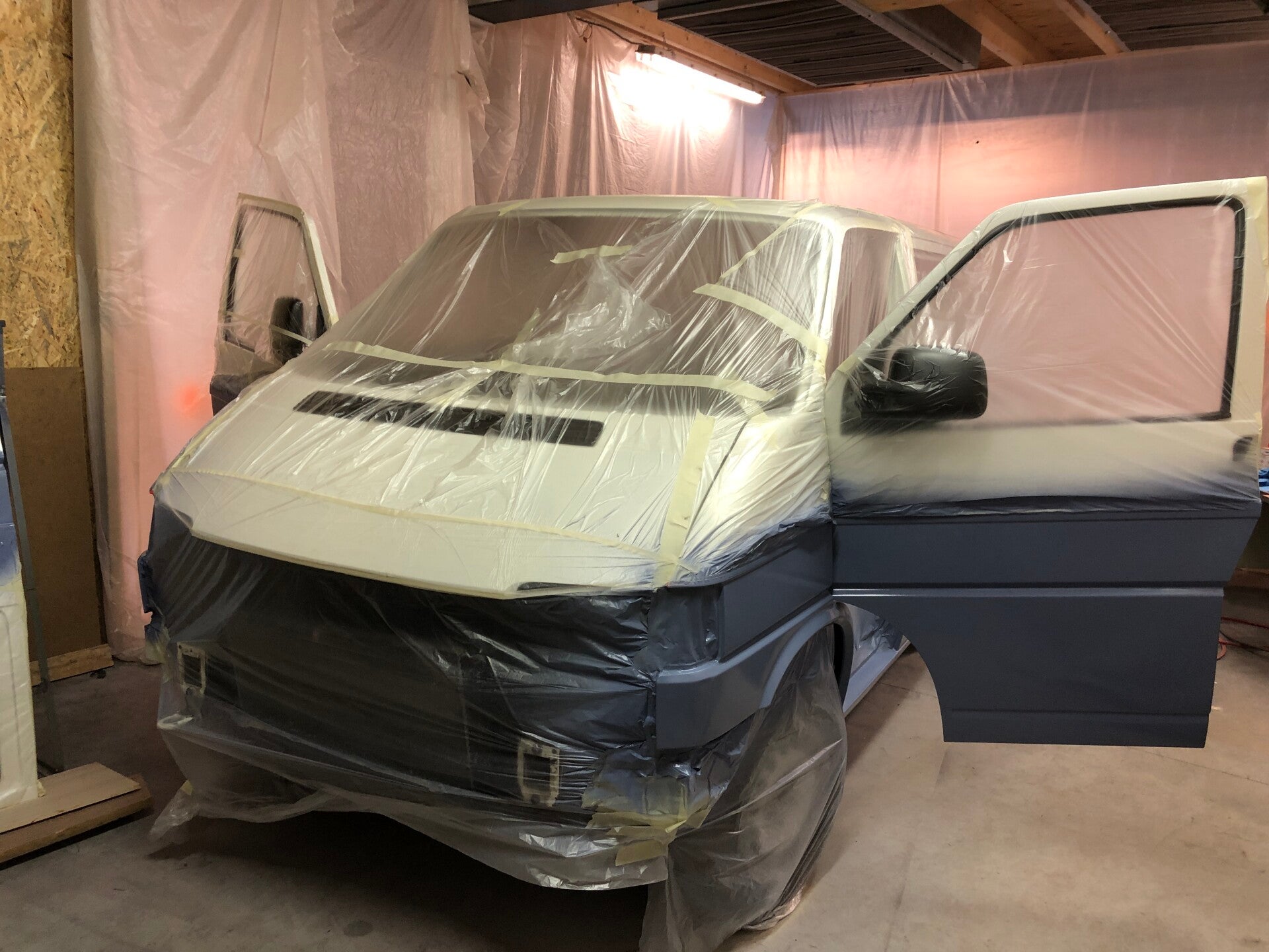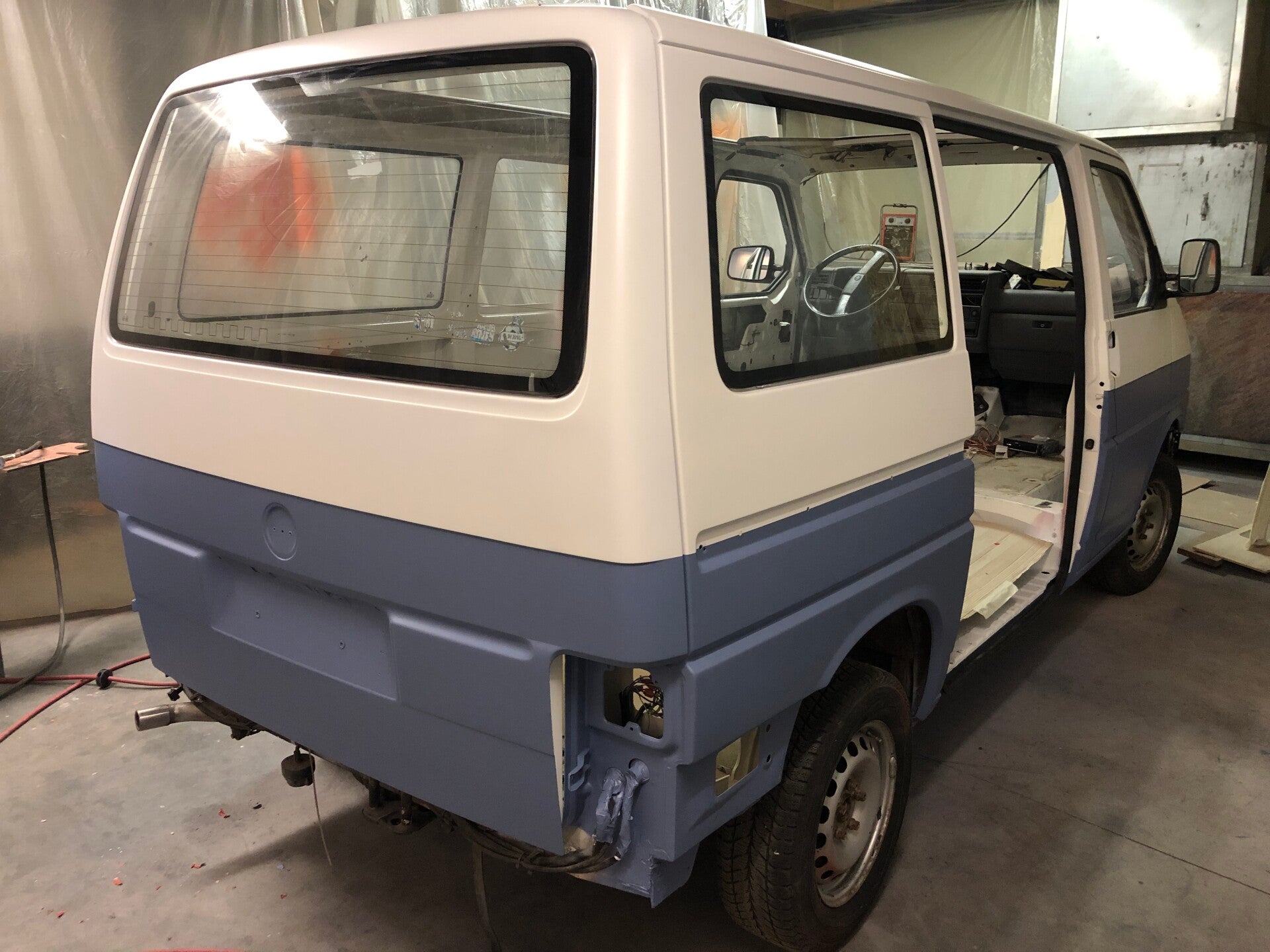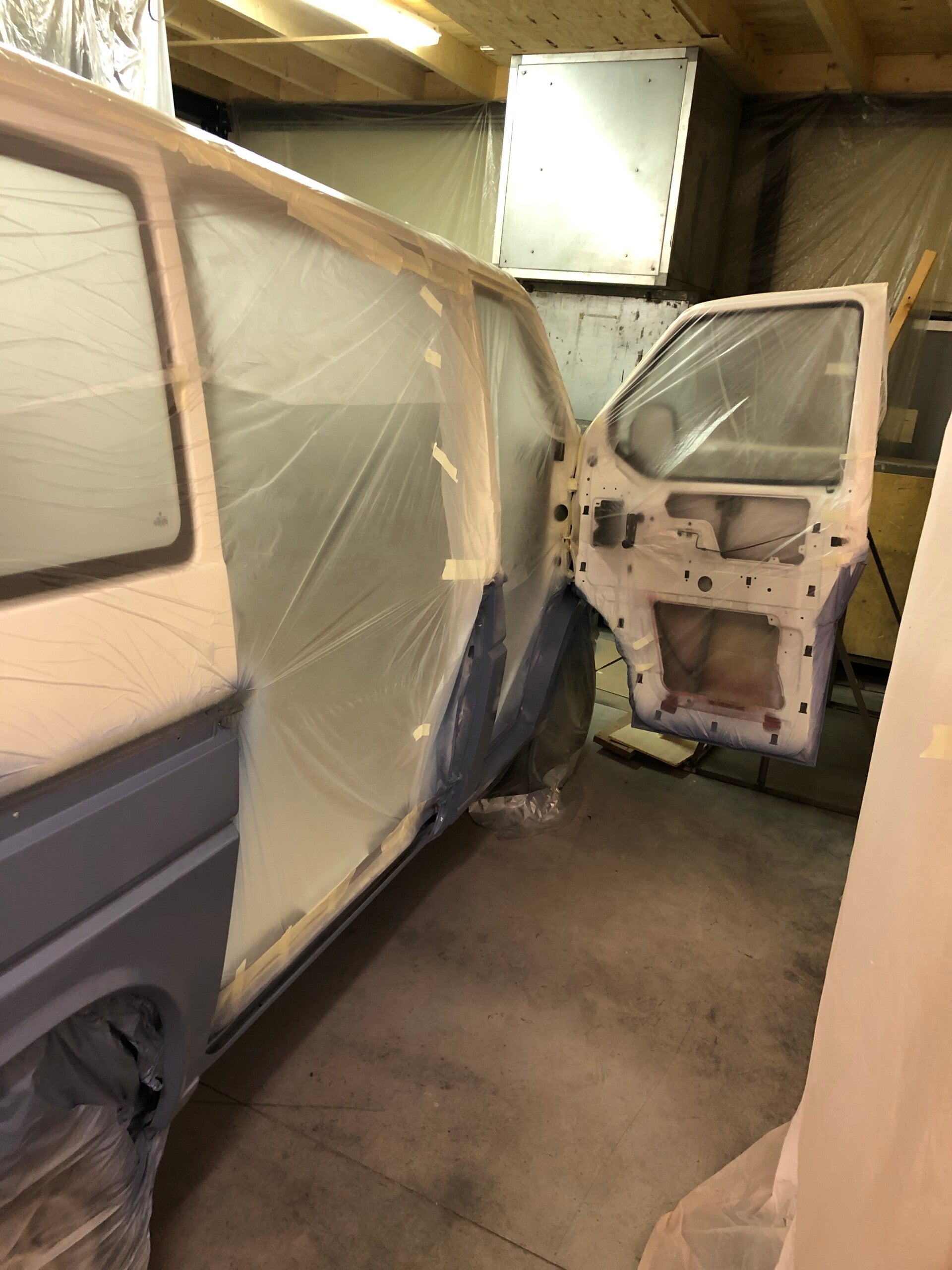 de bus is helemaal kaal gemaakt, behandeld en gespoten met een matte 2 componenten lak.
